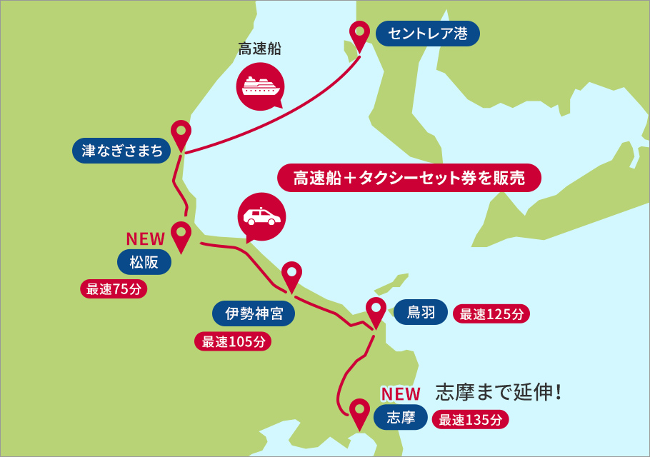 津なぎさまち港を経由し、主要観光地である伊勢・鳥羽・志摩・松阪まで快適に移動できます。