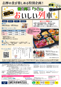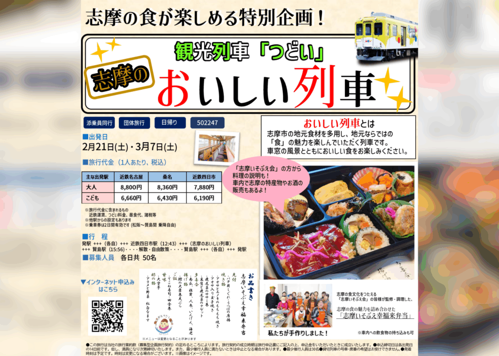 志摩の“食”の魅力を列車の旅とともに楽しめる特別企画、観光列車「つどい」 志摩のおいしい列車が運行されます。