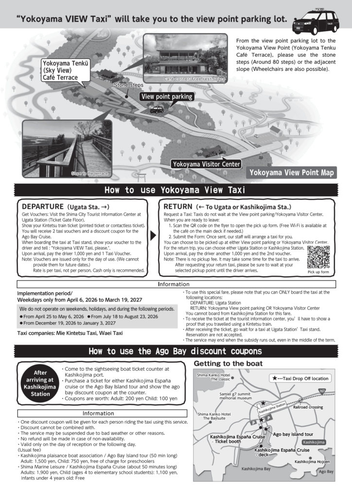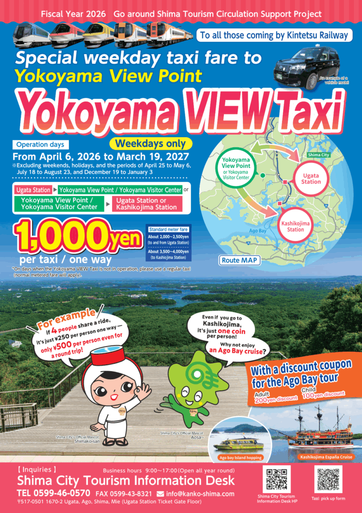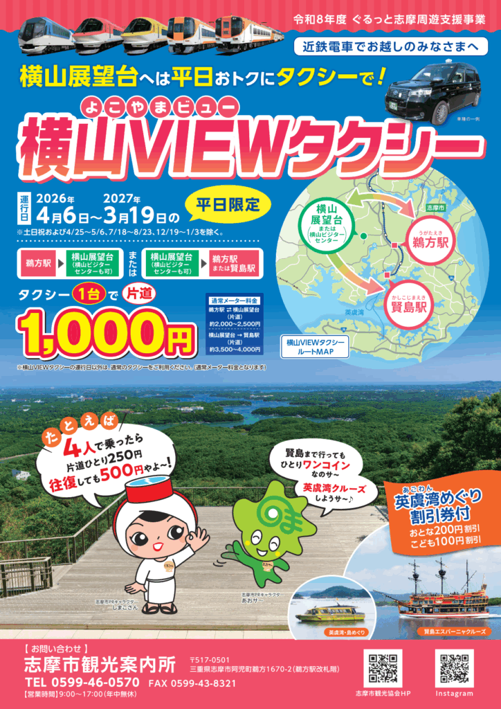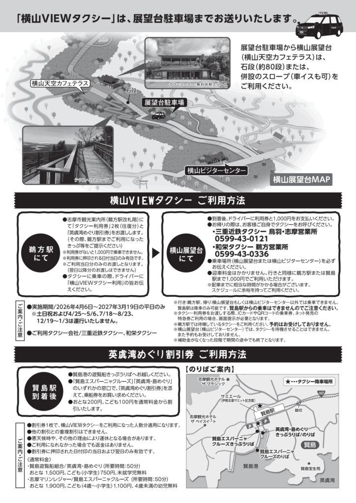 | ご利用可能区間 | 行き:鵜方駅 → 横山展望台または横山ビジターセンター 帰り:横山展望台または横山ビジターセンター → 鵜方駅または賢島駅 |