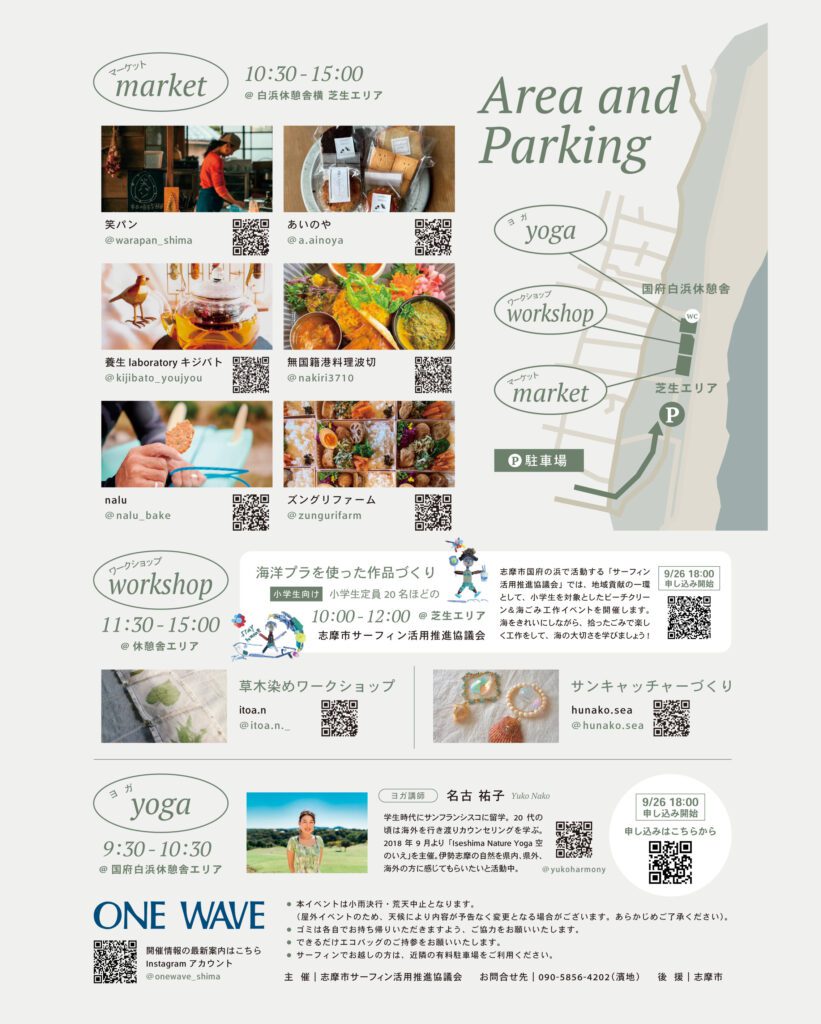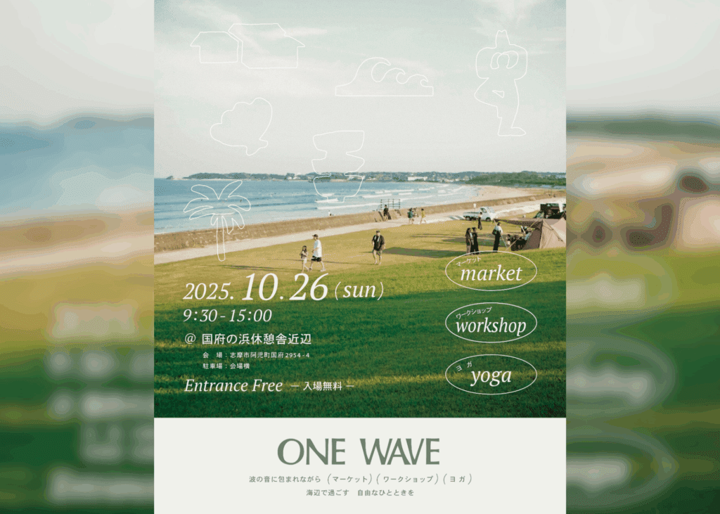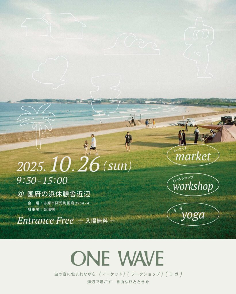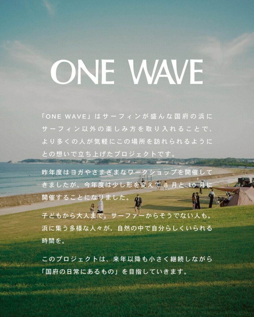 「ONE WAVE」はサーフィンが盛んな国府の浜にサーフィン以外の楽しみ方を取り入れることで、 より多くの人が気軽にこの場所を訪れられるようにとの想いで立ち上げたプロジェクトです。