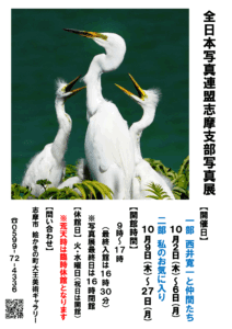 一部は10月2日(木)から10月6日(月)まで、二部は10月9日(木)から10月27日(月)までの間、全日本写真連盟志摩支部写真展が開催されます。