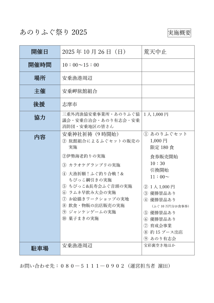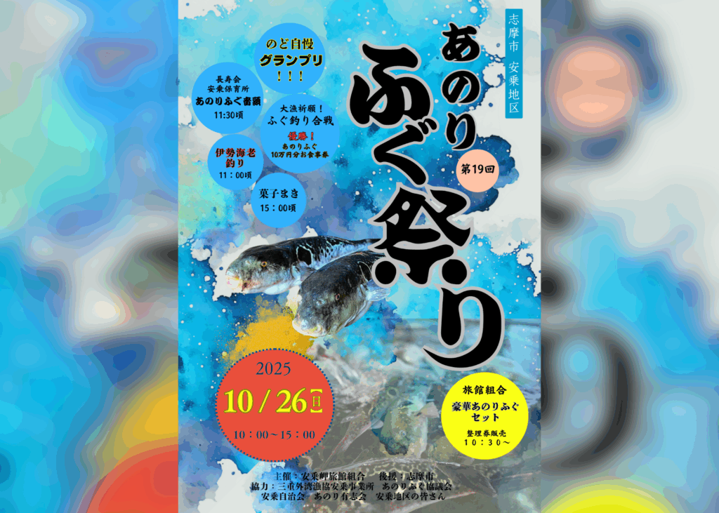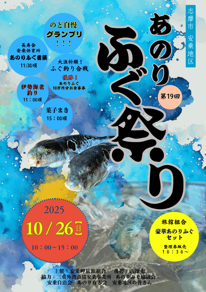 2025年10月26日(日)、安乗漁港周辺にて「あのりふぐまつり 2025」が開催されます。