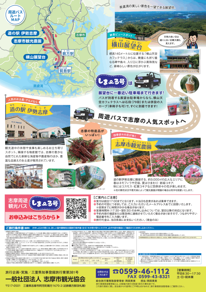 志摩随一のビュースポット横山展望台と季節の花いっぱいの志摩市観光農園をお楽しみいただけます。ご家族やお友達をお誘い合わせの上、ぜひご利用ください。