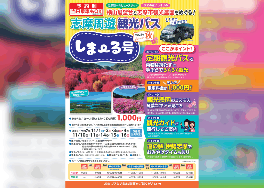 この夏に続きコスモス・紅葉コキアの開花に合わせて志摩周遊観光バス「しま~る号」が運行されます!