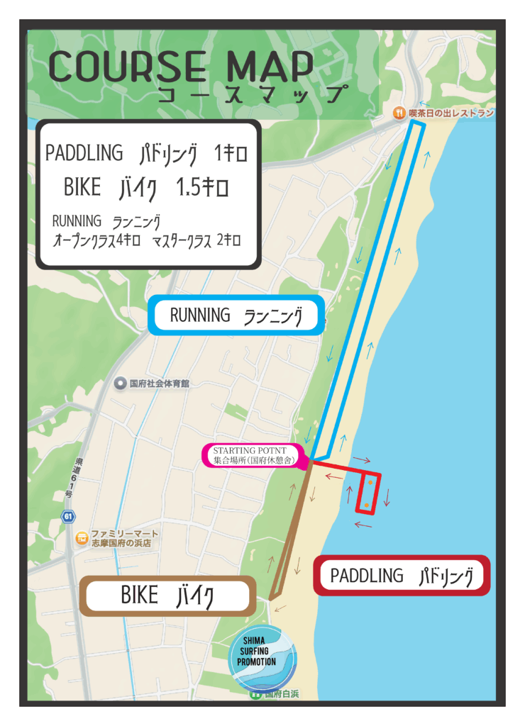 本大会は、サーフボードを使った パドリング(約1km)、海岸沿いを走る バイク(約1.5km)、そして ランニング(2~4km)の3種目を連続して行う複合競技です。