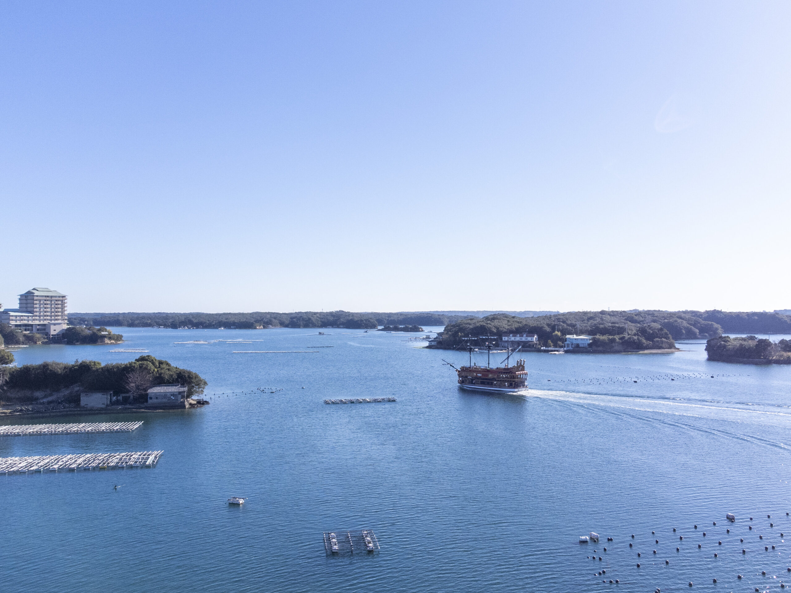 日の出とともに、暗間に隠れていたあご湾の景観が姿をあらわし、リアス海岸の美しさや海面に浮かぶ真珠筏など、特有の景色をお楽しみいただけます。