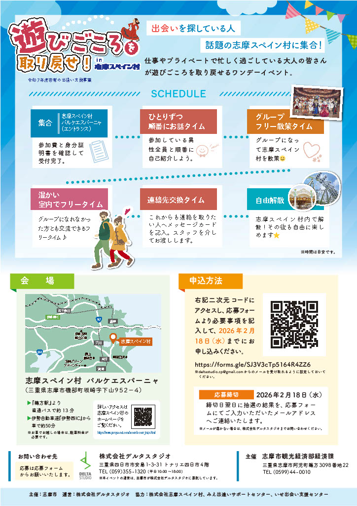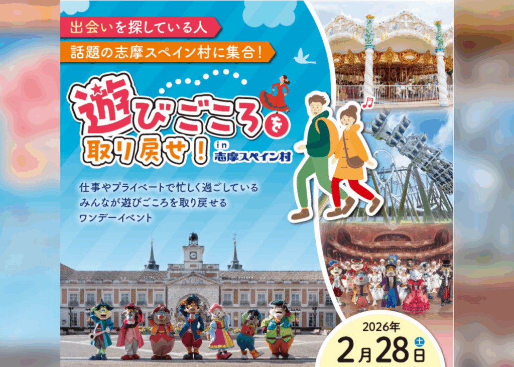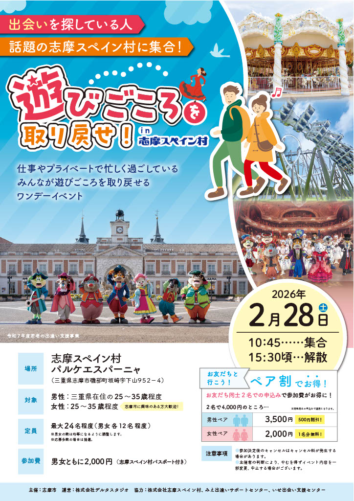 志摩市の人気テーマパーク「志摩スペイン村」を舞台に、20〜30代の大人の皆さま向け出会いイベント 「遊びごころを取り戻せ!in 志摩スペイン村」 を開催します。