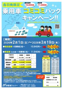 三重県・鳥羽と愛知県・伊良湖を結ぶ伊勢湾フェリーでは、期間限定でお得な乗船プラン「コミコミパック」を実施しています。