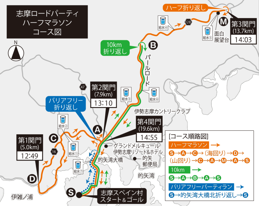 | スタート~ゴール (制限時間) | 12:10~15:10(180分) ※時間制限を設定した関門を設けます。 第1関門=(5.0km)地点 12:49 第2関門=(7.9km)地点 13:10 第3関門=(13.7km)地点 14:03 第4関門=(19.6km)地点 14:55 |