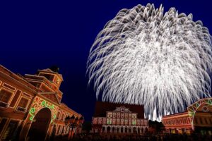 夜の志摩スペイン村を華やかに彩るナイトパレード「エスパーニャカーニバル“ブエン ビアヘ”」と大迫力の花火「ムーンライトフィナーレ」を上演します。