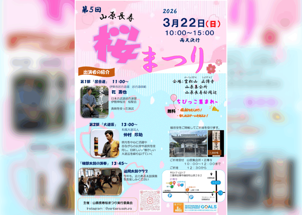 | 会場 | 霊松山 正傳寺、山原集会所、山原長寿桜周辺 (三重県志摩市磯部町山原282) |