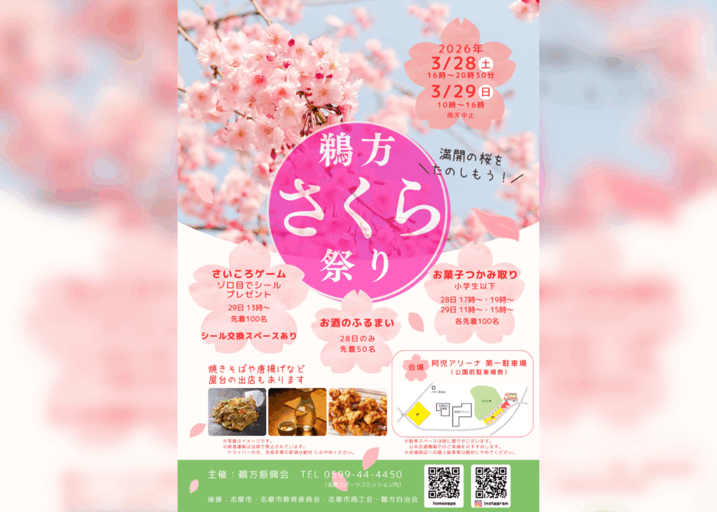 2026年3月28日(土)・29日(日)の2日間、阿児アリーナ第一駐車場(公園前駐車場奥)にて 「鵜方さくら祭り」 が開催されます。