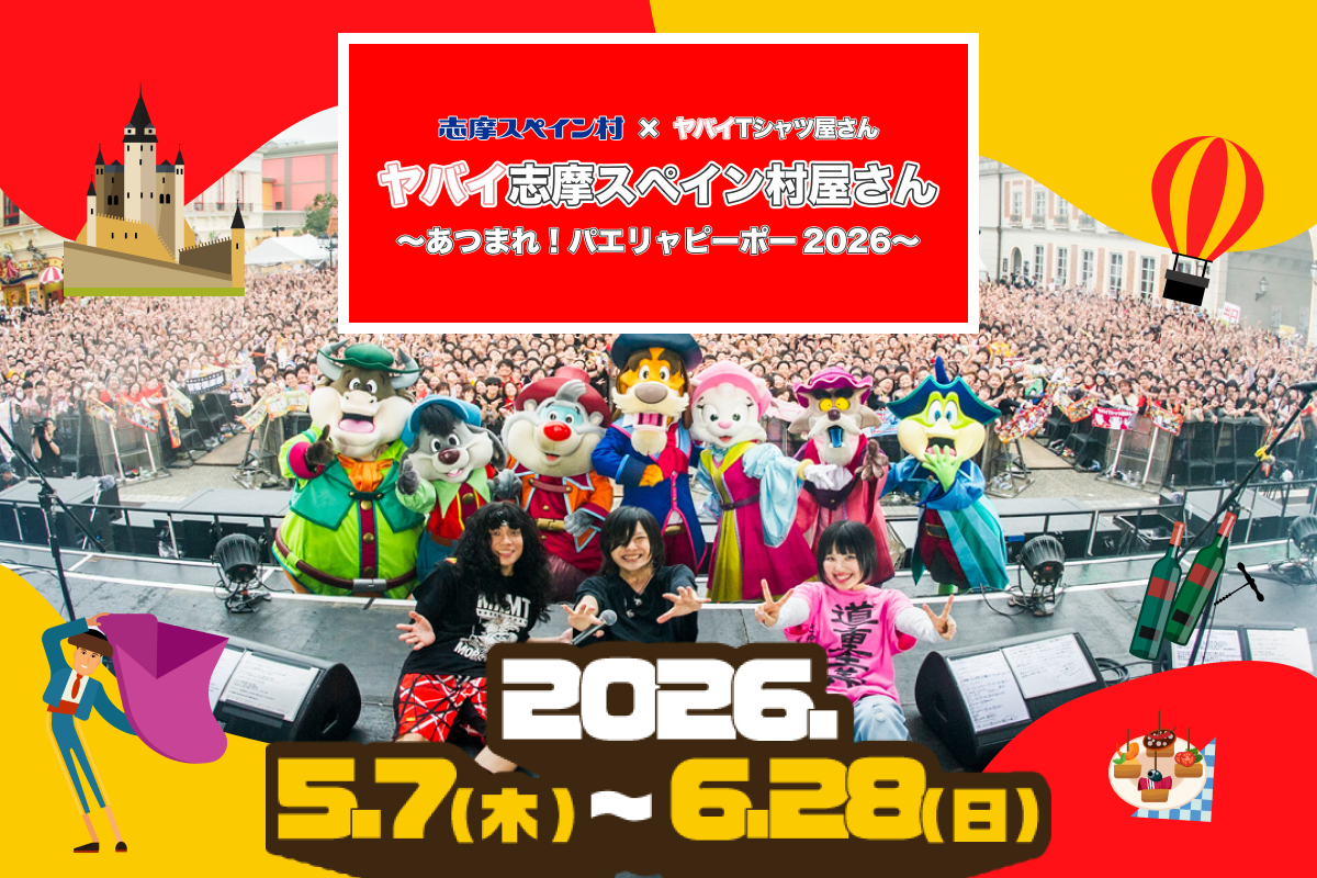2026年5月7日(木)から6月28日(日)までの53日間、志摩スペイン村にて、人気ロックバンド「ヤバイTシャツ屋さん」とのコラボイベント「ヤバイ志摩スペイン村屋さん ~あつまれ!パエリャピーポー2026~」 が開催されます!