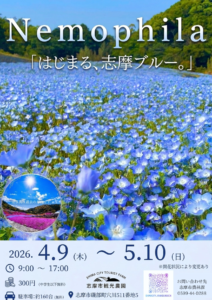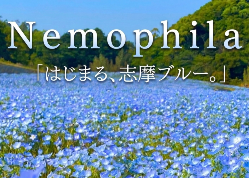 「Nemophila(ネモフィラ)『はじまる、志摩ブルー。』」 と題し、志摩市観光農園では、春ならではの美しい景色をご覧いただけます。