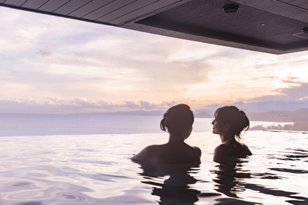 露天風呂はインフィニティ温泉となっており、日本の夕陽百選に選ばれた志摩市浜島町の黄金色に染まる海の絶景をお楽しみいただけます。