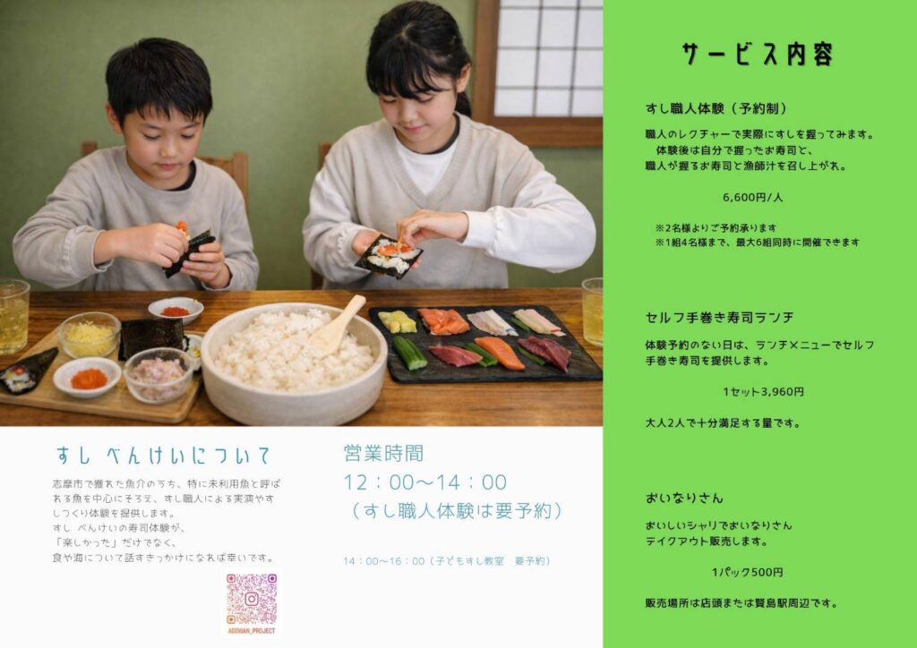志摩で水揚げされた魚介を使用した寿司の握り体験(予約制)と、セルフ手巻き寿司ランチを提供します。